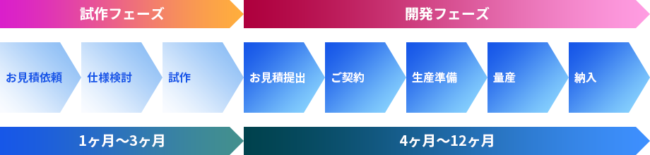 通常、試作は1〜3ヶ月、開発~量産は4〜12ヶ月程度です(目安)。