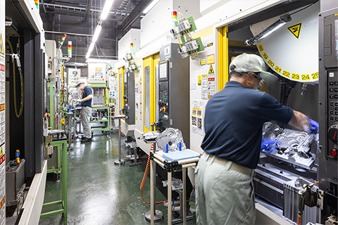 自動車に使われるエンジン部品などの製造を行います。鉄やアルミの加工、検査、組立など、さまざまな工程があります。